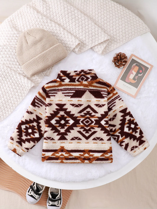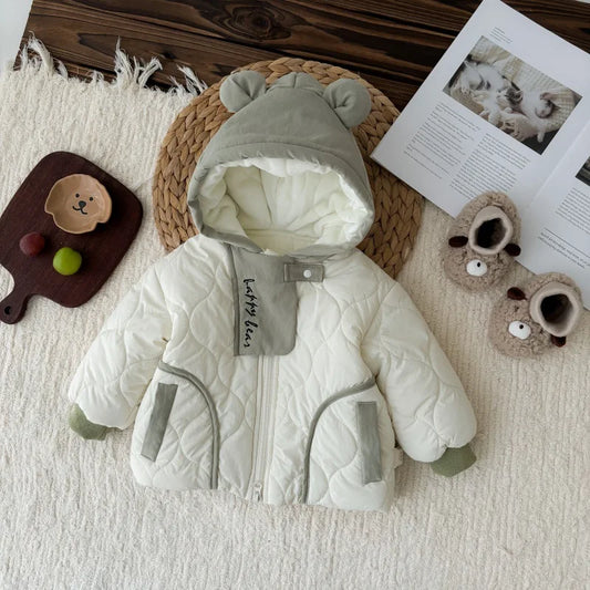 White Hooded Zipper Plush Baby Jacket (0-3Y) - Thick Winter Patchwork Coat